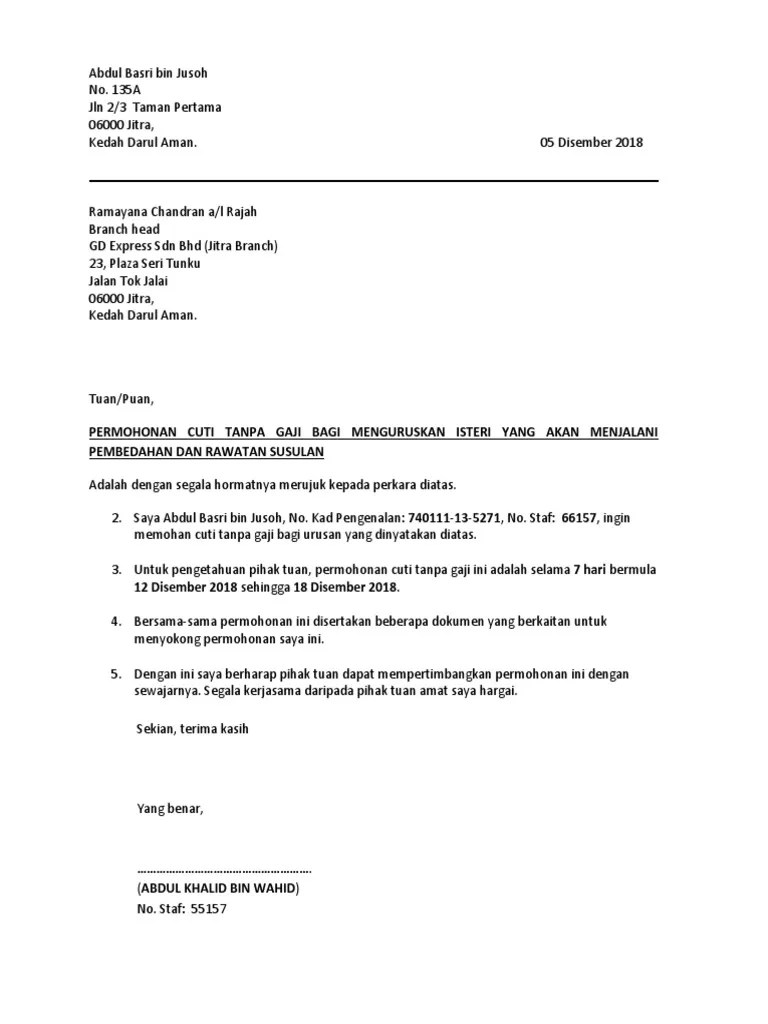 The collection that consisting of chosen picture and the best amongst others. Full pdf package download full pdf package. Salinan dokumen / surat sekongan hendaklah dikepilkan bersama. Nov 15, 2021 · surat cuti tanpa gaji pdf. (iv) jenis cuti sebenarnya (berdasarkan. Semua contoh ada seperti di bahagian bawah artikel ini. Mungkin ada syarikat yang memberikan peluang kepada pekerjanya menyambung pengajian dan membenarkan untuk bercuti tanpa gaji atau separuh gaji sekiranya termasuk dalam kontrak kerja. Surat pekeliling bil 4 tahun 2009.pdf Borang 3c borang permohonan cuti cuti tanpa gaji/cuti separuh gajucuti tanpa rekod di bawah perintah am bab c. Pegawai y/m klinik pergigian tuaran tuan, memohon kelulusan cuti tanpa gaji selama 31 hari dengan segala hormatnya, perkara di atas adalah dirujuk. Contoh surat cuti tanpa gaji berserta 10 alasan terbaik. Bergantung kepada keperluan dan dimana anda bekerja. Layak dimohon oleh pegawai berstatus tetap sahaja.